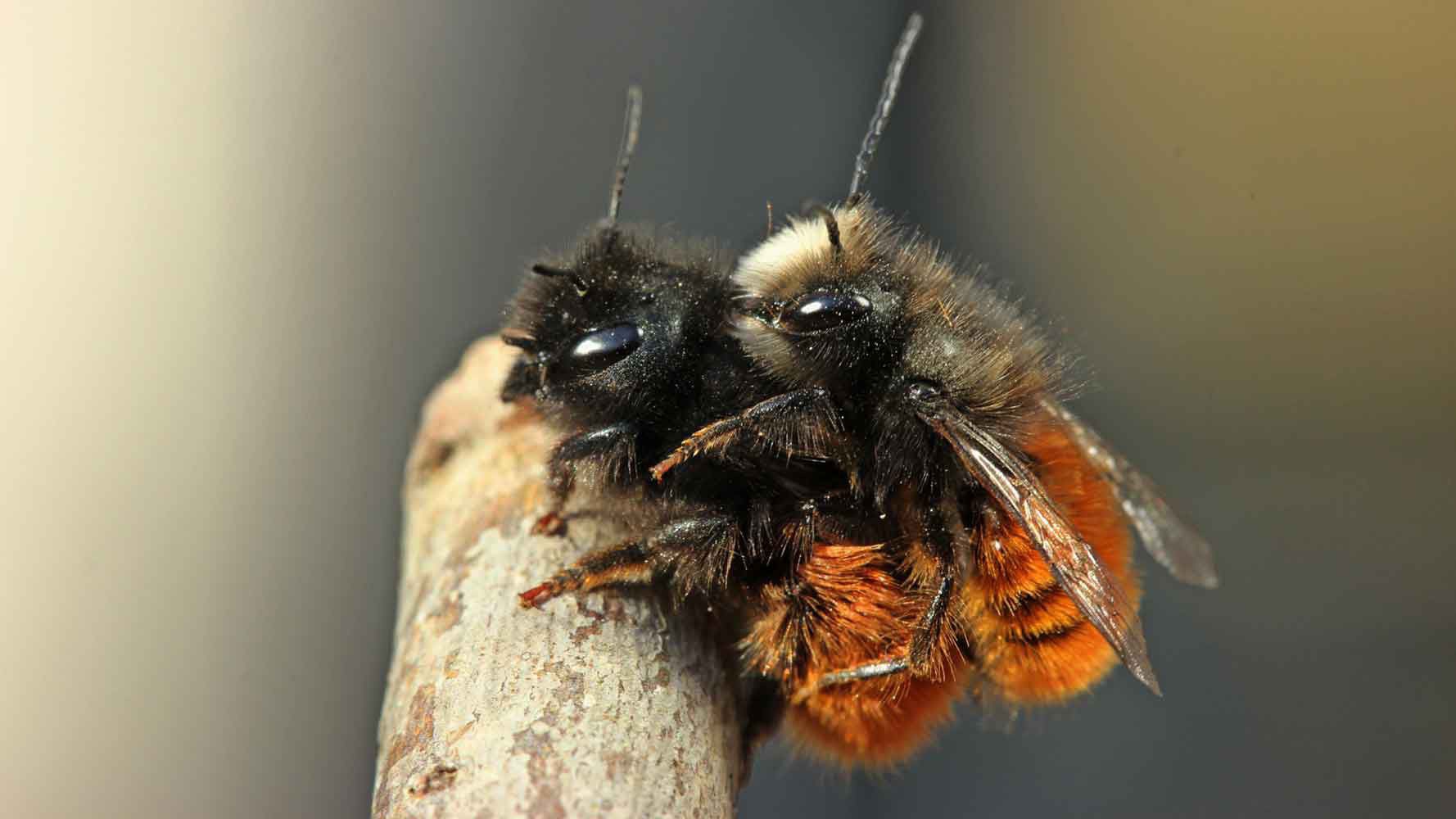 The females have two tiny horns on their foreheads, hidden between the hairs. Unlike the honeybees, these bees do not live in colonies. Each bee keeps to itself. They build their nests in all types of hollow spaces.